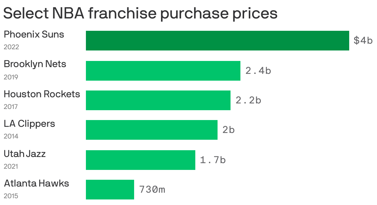 Why it matters: This is a record-shattering price for a franchise that plays in just the 11th-largest U.S. media market, doesn't own its arena and has never won a league title. - This price massively increases the value of all other NBA teams, possibly spurring new deals. It also could help Marc Lore and Alex Rodriguez finish finding their financing to buy out the Minnesota Timberwolves, since they're now getting in at a veritable bargain.